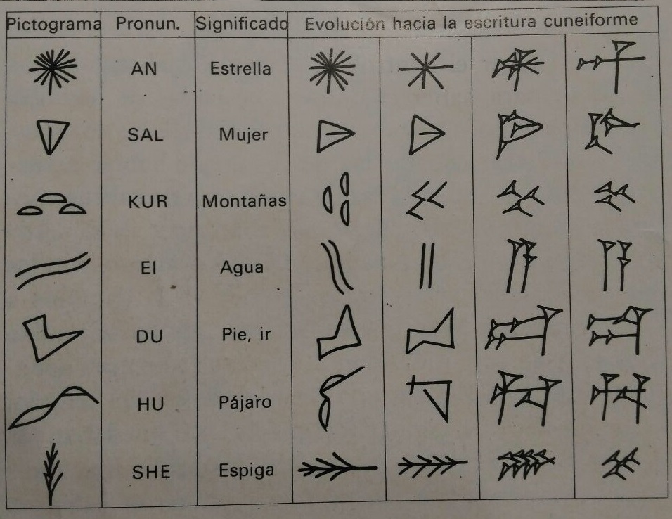 De esos signos apareció el primer sistema de escritura. Este sistema se constituye de una serie de signos pictográficos, admitidos por la sociedad, y que se representan gráficamente los objetos precisos de los que se habla o la idea que se quiere expresar sobre esos objetos. Si iban a escribir palabras difíciles de representar, lo único que podían hacer era componer varias palabras más sencillas. Los signos tenían un valor ideográfico. En poco tiempo se crearon muchos signos; el sistema pronto se volvió inutilizable por la cantidad tan numerosa de signos existentes. Para simplificar la escritura de Mesopotamia se realizaron dos avances importantes: primero, se abandonó el sistema ideográfico y los símbolos se crearon en un trozo de junco que tenía una sección triangular. Los ideogramas se hacían imprimiendo varios signos en forma de cuña, que proporcionan lo que hoy se llama escritura cuneiforme. Segundo, el siguiente procedimiento se basó en reducir el número de signos “determinantes” que tenían el valor de adjetivos. Así sólo se iba a necesitar un signo para una palabra, al que se le añadirían signos determinantes. Ejemplo, al signo de la “Oveja” se le podría agregar un signo determinante que señalaría si se trata de una hembra, un macho o una cría.