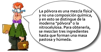 La pólvora es una mezcla física y no una composición química, y en esto se distingue de la moderna “pólvora” o la nitrocelulosa. Para obtenerla, se mezclan tres ingredientes hasta que forman una masa pastosa y húmeda. La masa se comprime a tremenda presión en bloques que, a continuación, se trocean y reducen a tamaños granulares. Estos se hacen pasar por pedazos y se clasifican por tamaños según sea el uso al que se destinarán. Los ingredientes son nitrato de potasio (caliche), carbón vegetal y azufre, debiéndose poner especial atención en la calidad del carbón vegetal, que se consideraba imprescindible para que el producto final estuviera dotado de gran fuerza explosiva. El carbón producido por una variedad del cornejo era el que se empleaba para armas cortas militares y para disparar con armas deportivas, mientras que el producido por la madera de aliso entraba en la composición de pólvora para cañones o armas de fuego de inferior calidad.